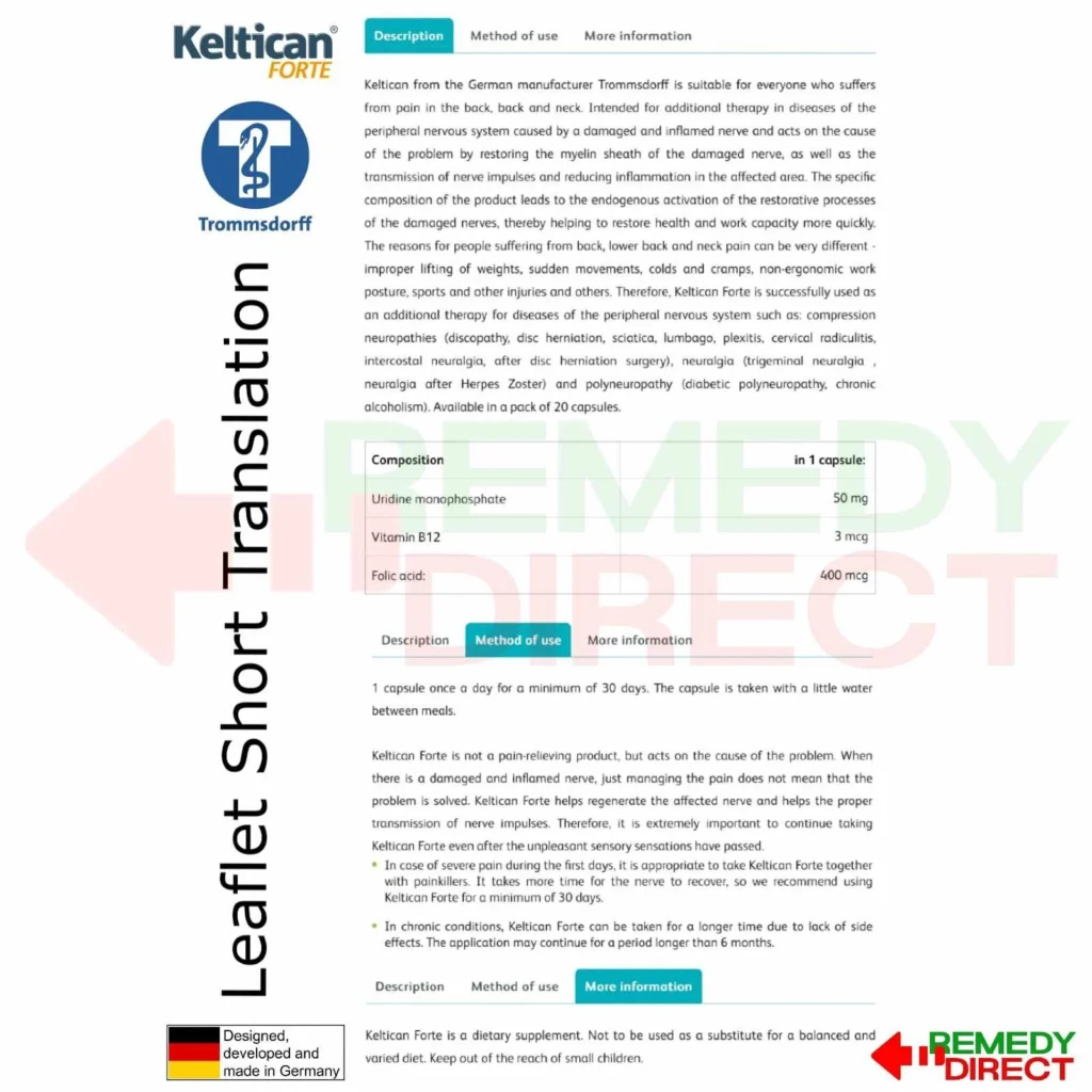 - Uridine monophosphate is a natural pyrimidine nucleotide, an activator of various enzymatic processes. It is important for carbohydrate and phosphorus metabolism. Penetrating into the cell, this active ingredient of the Keltican Complex is transformed into polyphosphate derivatives of uridine, which are active in the process of regenerating damaged peripheral nerves, which aids to the improvement of the nerve tissue structure, and reduction of pain intensity.